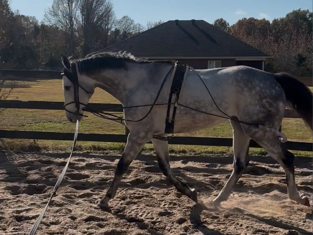 Moonpie is track trained, but never raced. Had a deep cut about 6 months ago that left some scar tissue, but he is very sound. Very mannerly stallion who could be a lovely hunter with his comfortable, large stride. Only 5 rides post track and he is already framing up. No spook, rear, bolt.